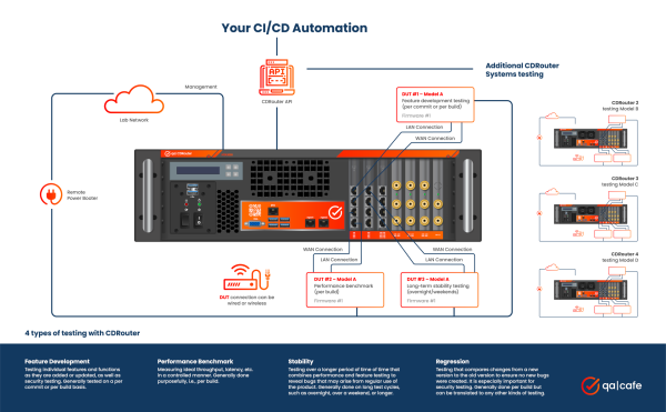 CDRouter's parallel testing capabilities allow you to run multiple test instances simultaneously, reducing the overall test execution time. This works great with a Continuous Integration/Continous delivery system that utilizes CDRouter’s automation API to start tests, track the results, and trigger further testing or action. Using parallel testing, a single CDRouter platform can be maximized to cover all four of the major testing types, as shown in this infographic: